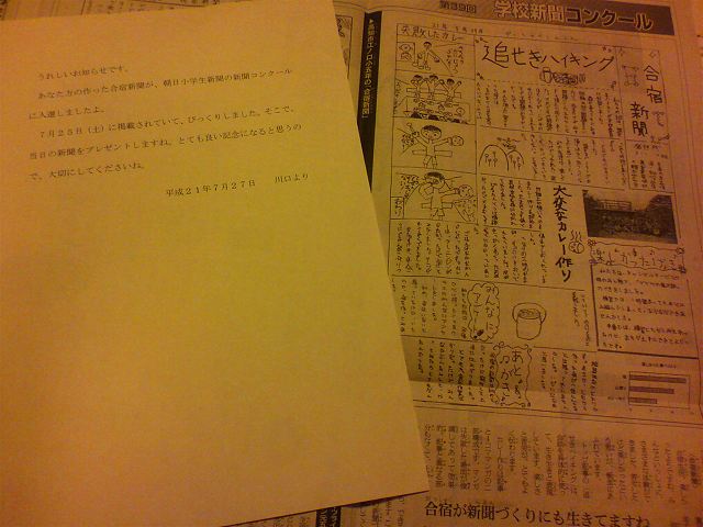ご丁寧に当日の新聞とコピー、先生のメッセージを送ってくれた