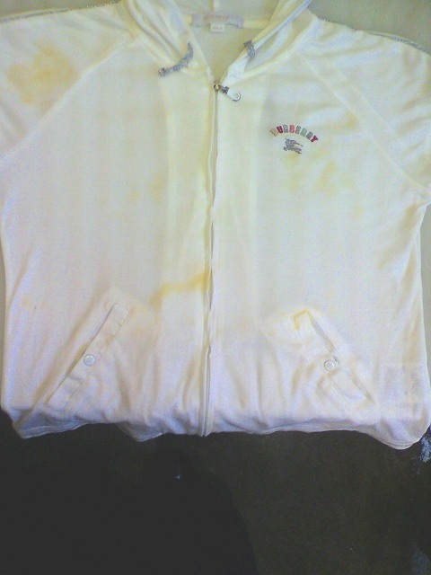 普段と変わらず普通に洗濯し乾燥までさせて取り出したら黄色い染みが出てたんで慌てて漂白したらしい、それでも全然取れなくて困っていると