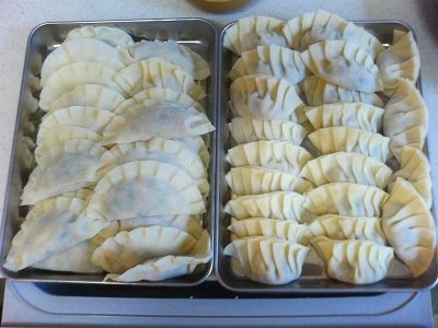 右が嫁さんが手で包んだ物、左が子供が餃子包む道具で作った物