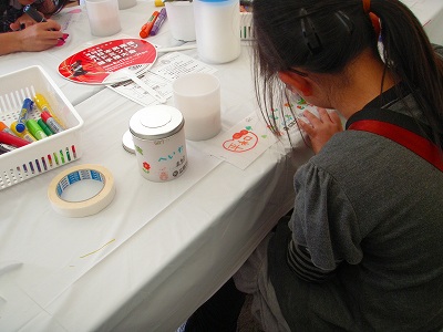 フラワーフェスティバル会場で平和メッセージを入れたフラワーキャンドルを作ったり