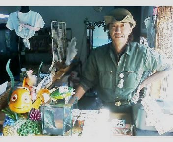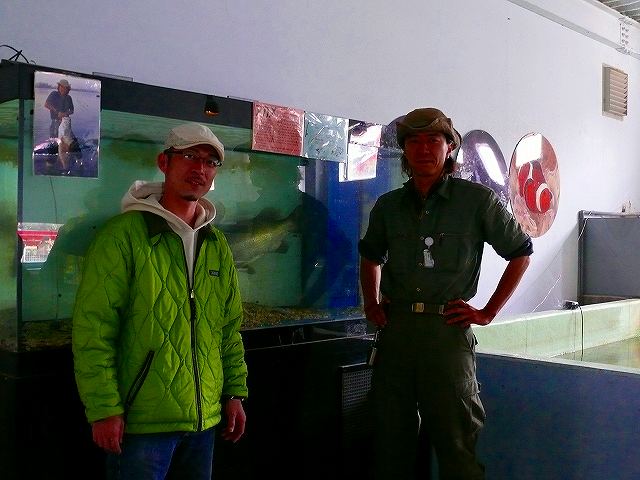 桜井さんが釣って展示している水槽の前でツーショット