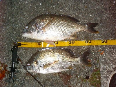 思いっ切りフッキングするとチヌ確定の引き。まずまずのサイズか?