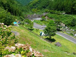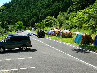 道路はココで行き止まり、駐車場は目の前、僕らの張ったテントの向こうには上部に行く道があるので奥のスペースは貸切状態になります、グループにはオススメ