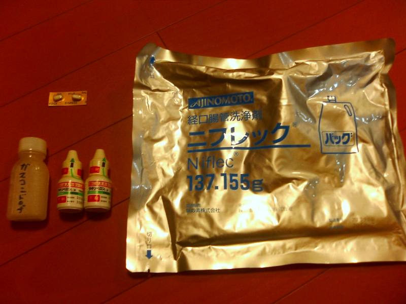 明日は朝からガスモチン(腸の動きを良くする薬)、ニフレックを2リットルに溶かし2時間掛けてゆっくり飲みます、腸管内圧上昇による腸管穿孔を起こすことがあるので早く飲むのはNG、腸管穿孔により死亡者が稀にいます、医師が観察しながら飲む事がこの事故を防ぐ第一の手段ですが僕はもう何回も飲んでるので家で飲むことが許されてます、