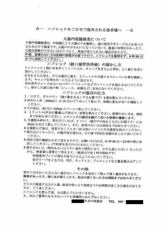 ニフレックを家で飲む場合の病院からの指示は下の画像